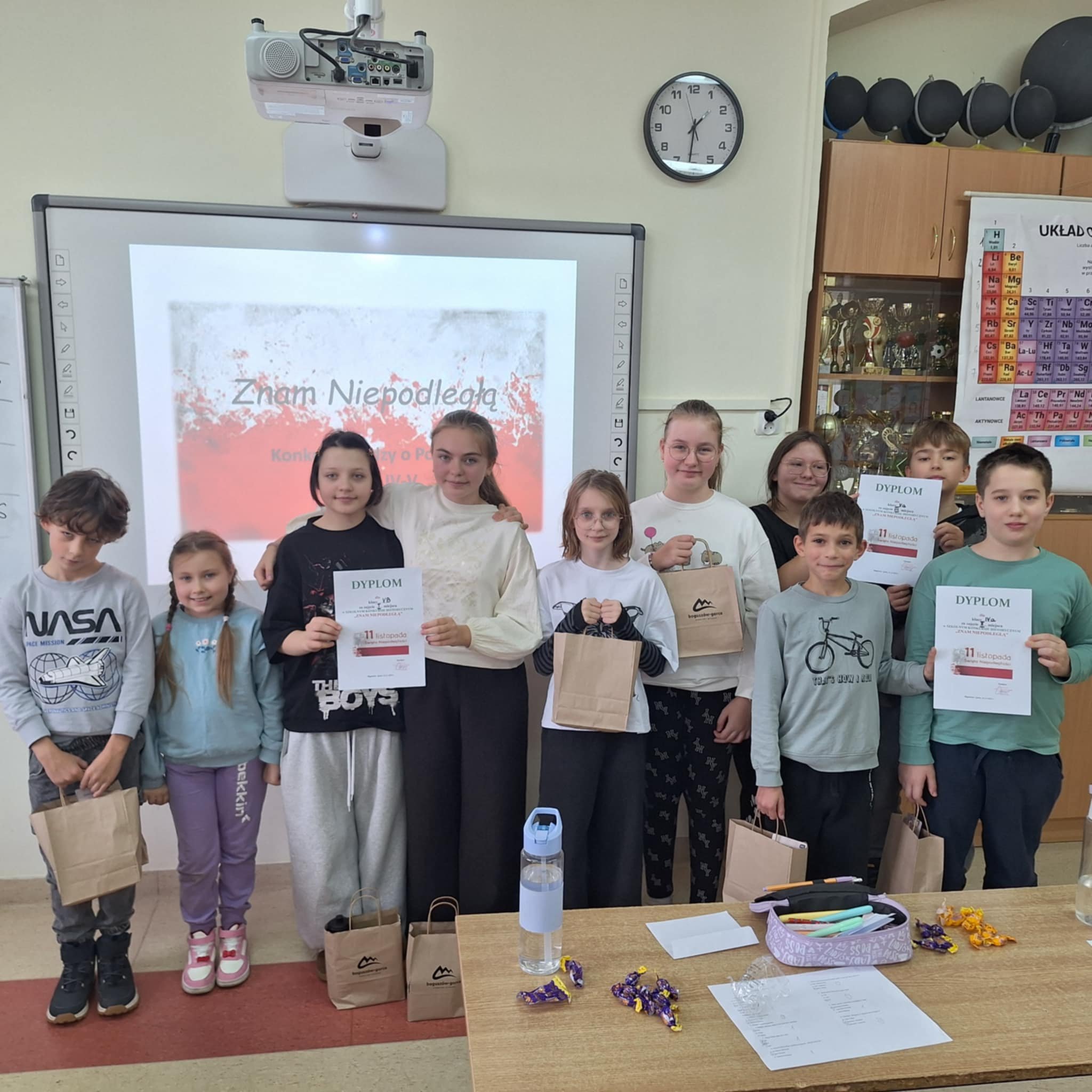 14.11 odbył się szkolny konkurs historyczny dla klas IV i V ,,Znam Niepodległą". Uczniowie rywalizowali w 5 kategoriach, dotyczących m.in. symboli narodowych, wybitnych Polaków, najważniejszych wydarzeń z historii Polski oraz zasad pisowni.